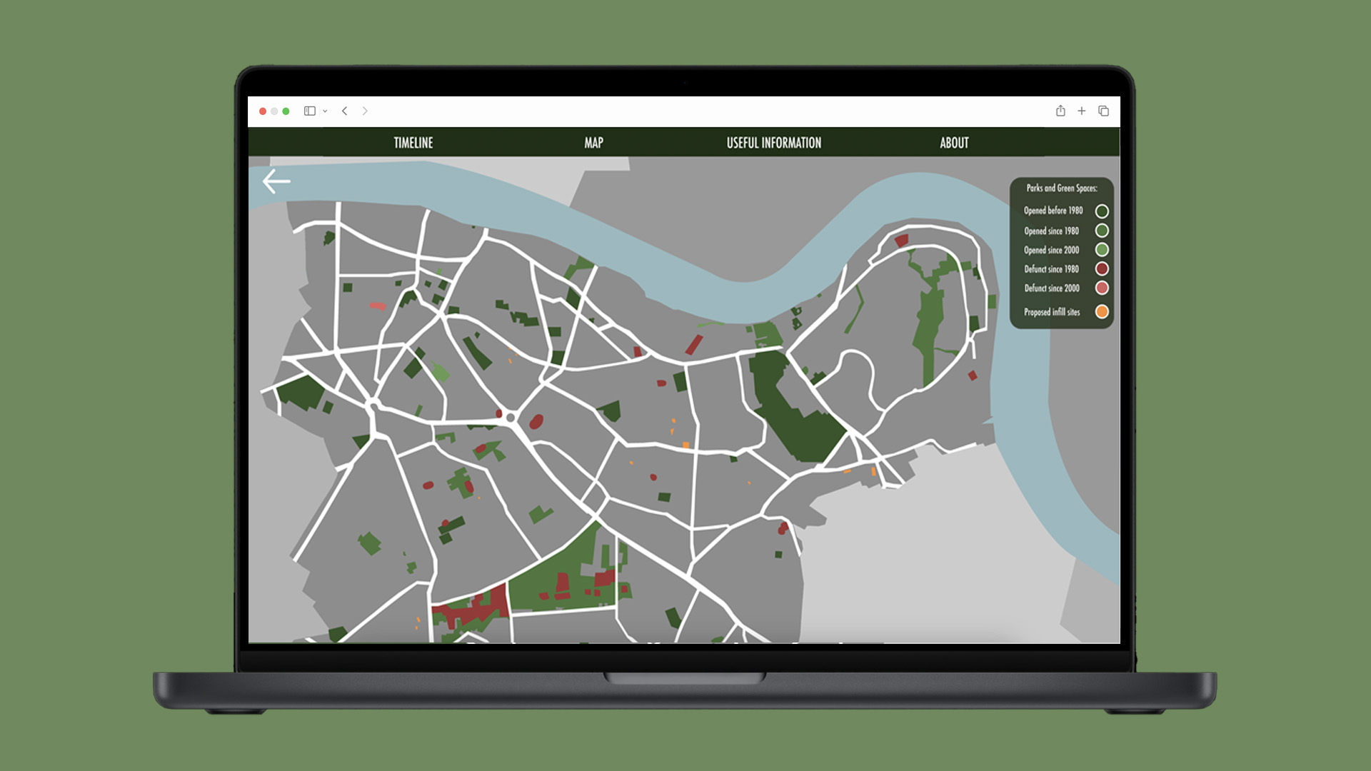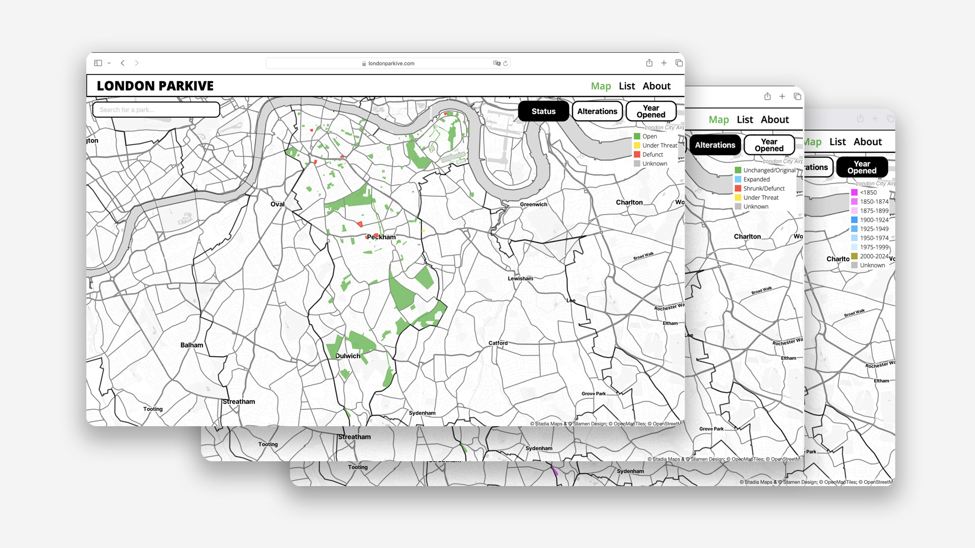 The London Parkive is an interactive map documenting the history and evolution of London's parks and open spaces, created as my final year project at university.