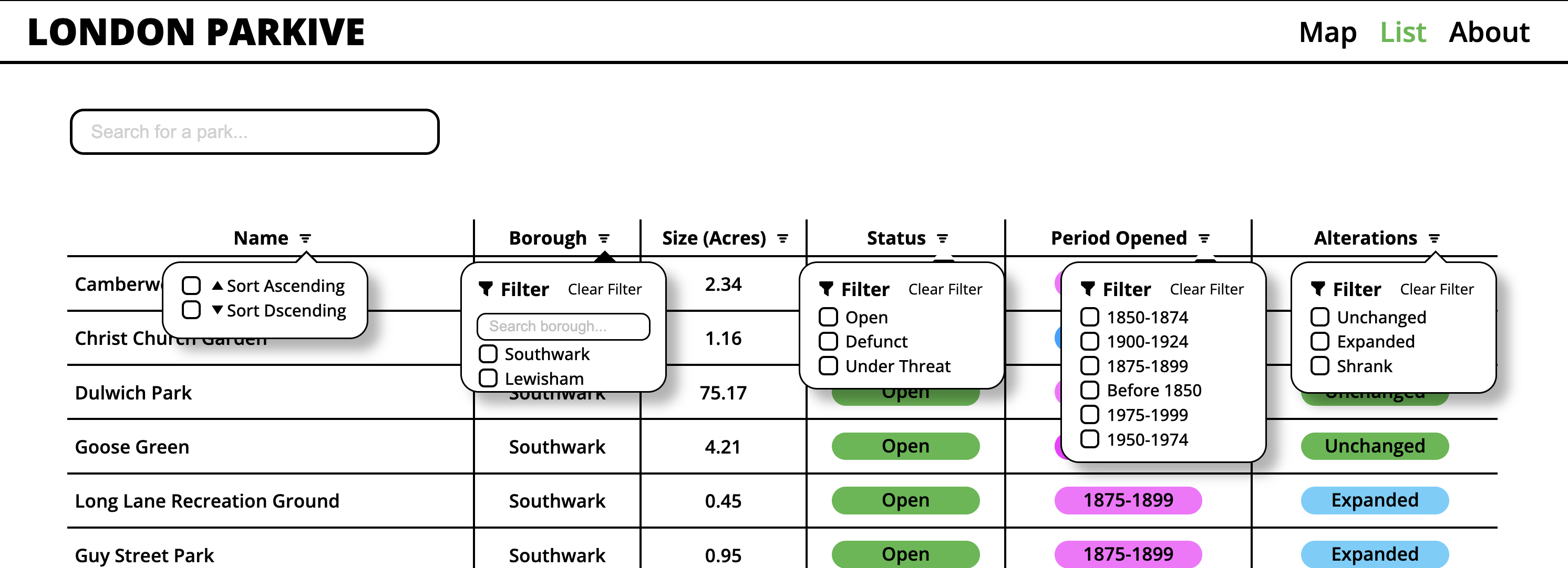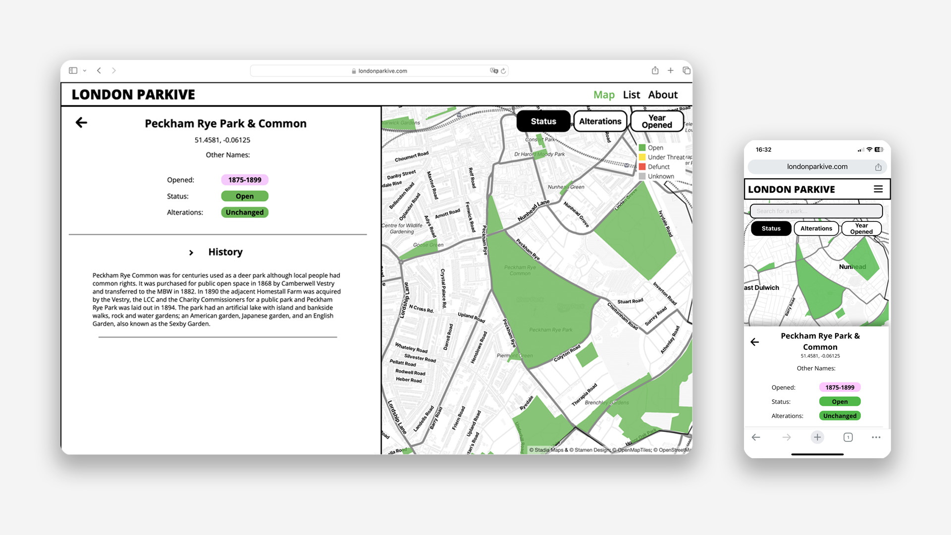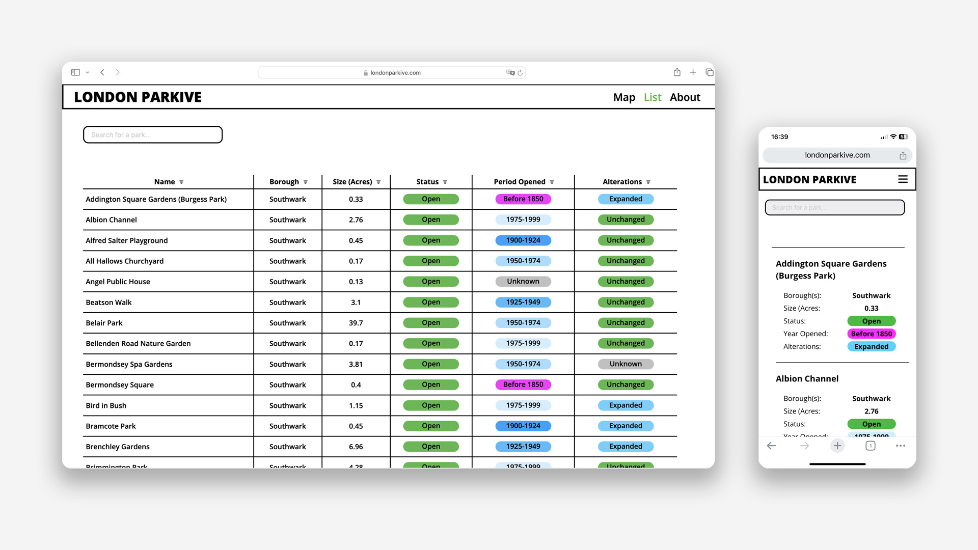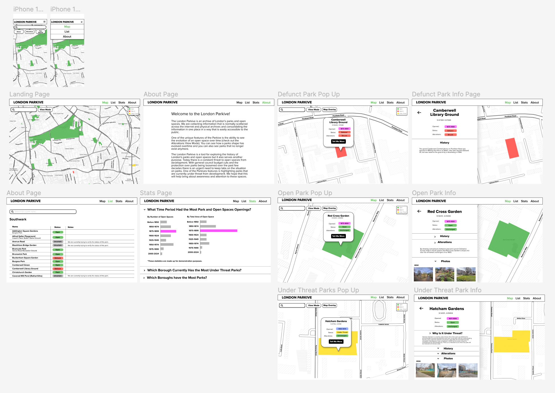 The London Parkive has a simple aesthetic. In truth, the designs were originally just meant to be the wireframes design which were intentionally kept simple as I was still learning how to code the website as I was building it and therefore didn’t want to be distracted by a complex design aesthetics. However, the simple designs make it accessible and easy to navigate and as I spoke with various people who had used the website it became clear that people actually liked the minimal aesthetic so I decided to stick with it. I initially intended to create high fidelity prototypes of the Parkive, in part because I wanted to practise using Figma and get better at using it. However I soon found that, I wanted to spend more time on actually coding the components, rather than prototyping them. Because I am the only person working on the project it didn’t make sense to spend loads of time prototyping something to just build it again using code so instead I made static wireframes and spent more time coding the components instead.