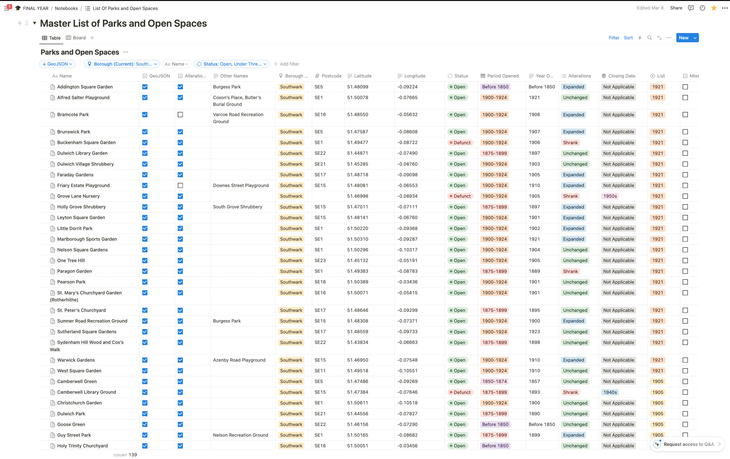 The information of the parks and open spaces I have collected has been added and organised on a Notion Spreadsheet. Information includes the geographical coordinates of the park, when it was opened, if the parks shape has changed overtime, and a brief history of the park. This spreadsheet has been converted to CSV and then to JSON format to add the website.