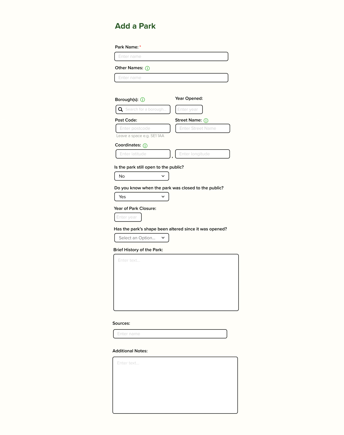 A form I have designed using Figma which could help streamline the process of adding park data. If this form was built it could be directly linked to a JSON file.