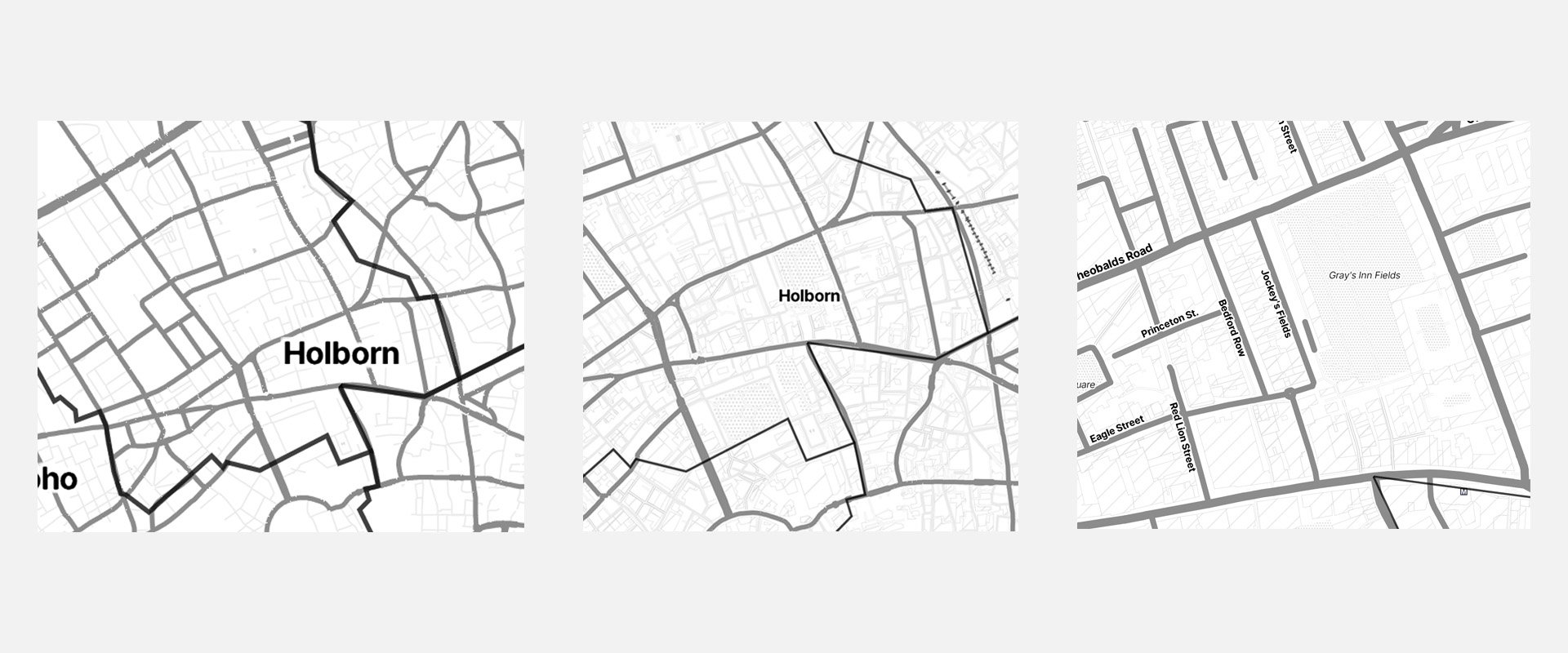 Stamens Toner Lite map at three different zoom levels.