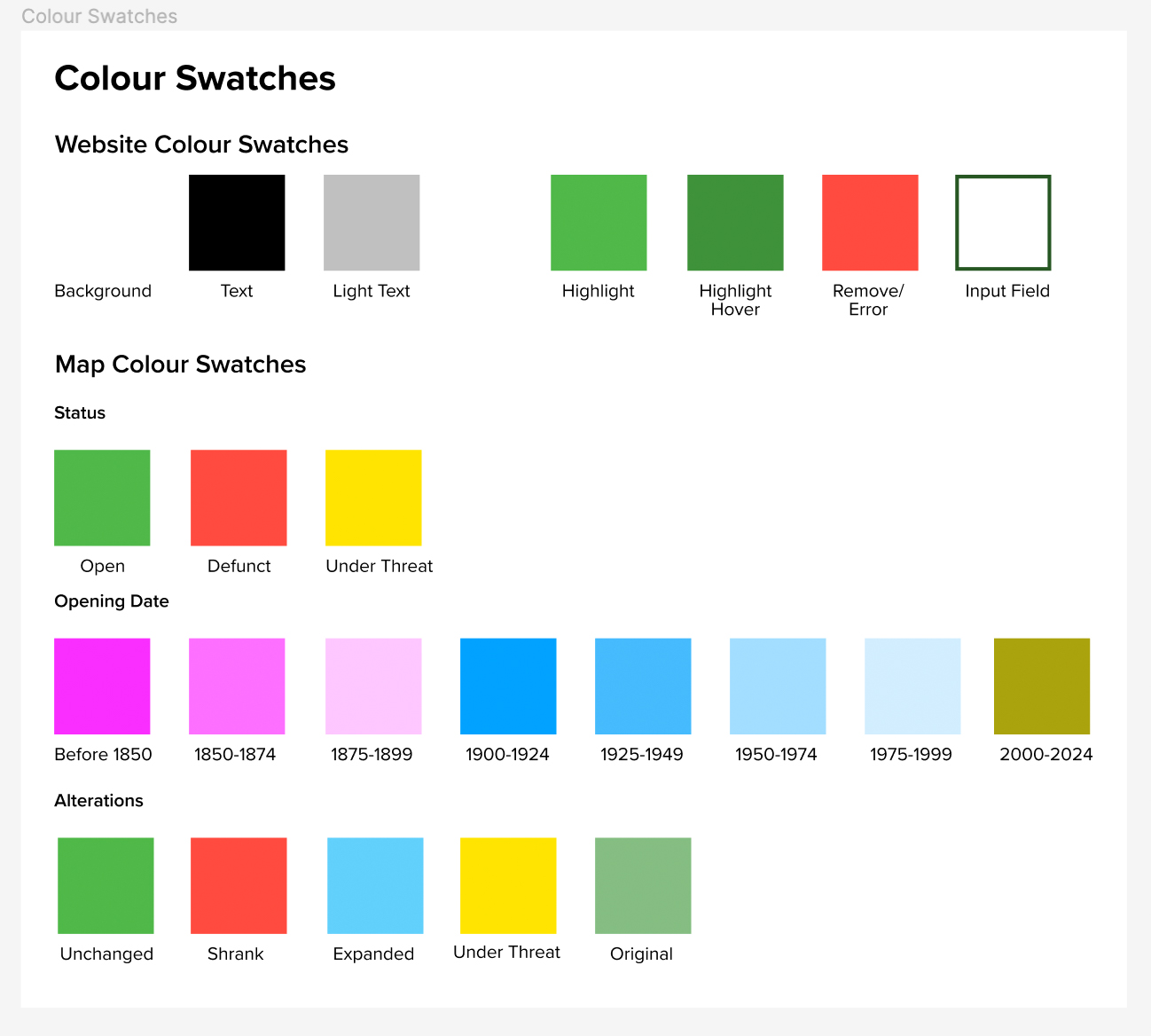 While the colour palette is mostly monochrome a lot of thought was put into the colour palette of the map keys. Especially for the ‘Year Opened’ view mode. I considered assigning random colours to the 8 keys in this view mode or using different opacity levels of one colour. However, the former felt too random and the latter was difficult to distinguish on a map so instead I went for three different colours (pink, blue and yellow) to represent each century and a gradient of each colour for each 25 year period. The colours are easy enough to distinguish but have enough correlation that patterns can be picked out from the data.