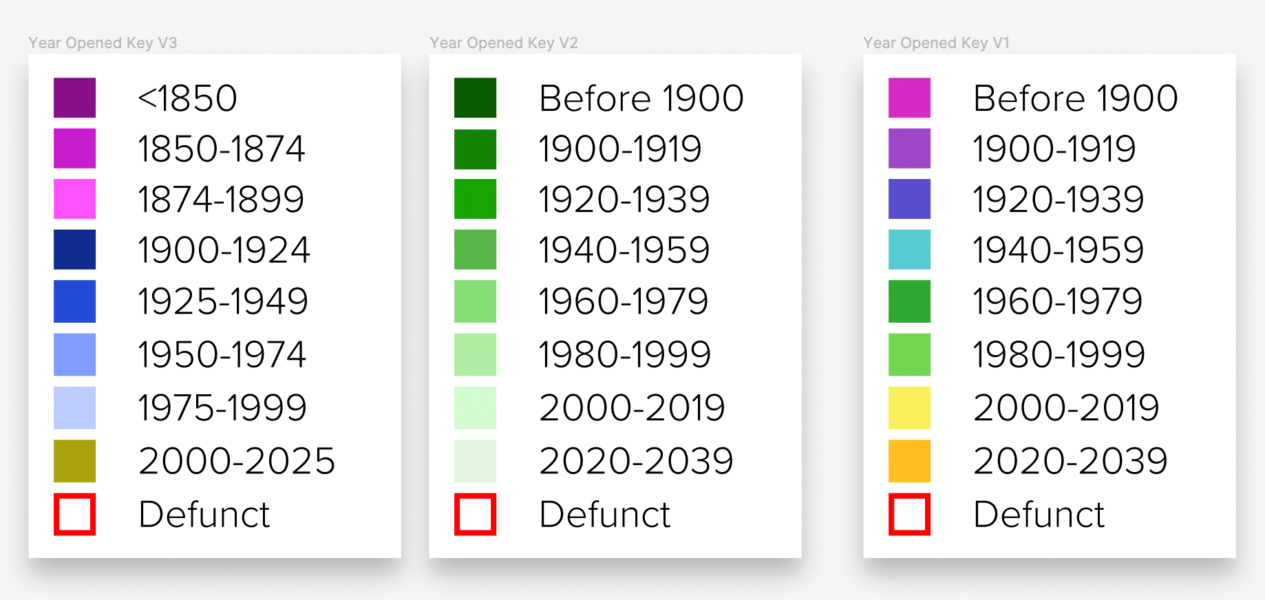 Different colour pallets for the ‘Years Opened’ that I considered before settling for something similar to the left colour palette.