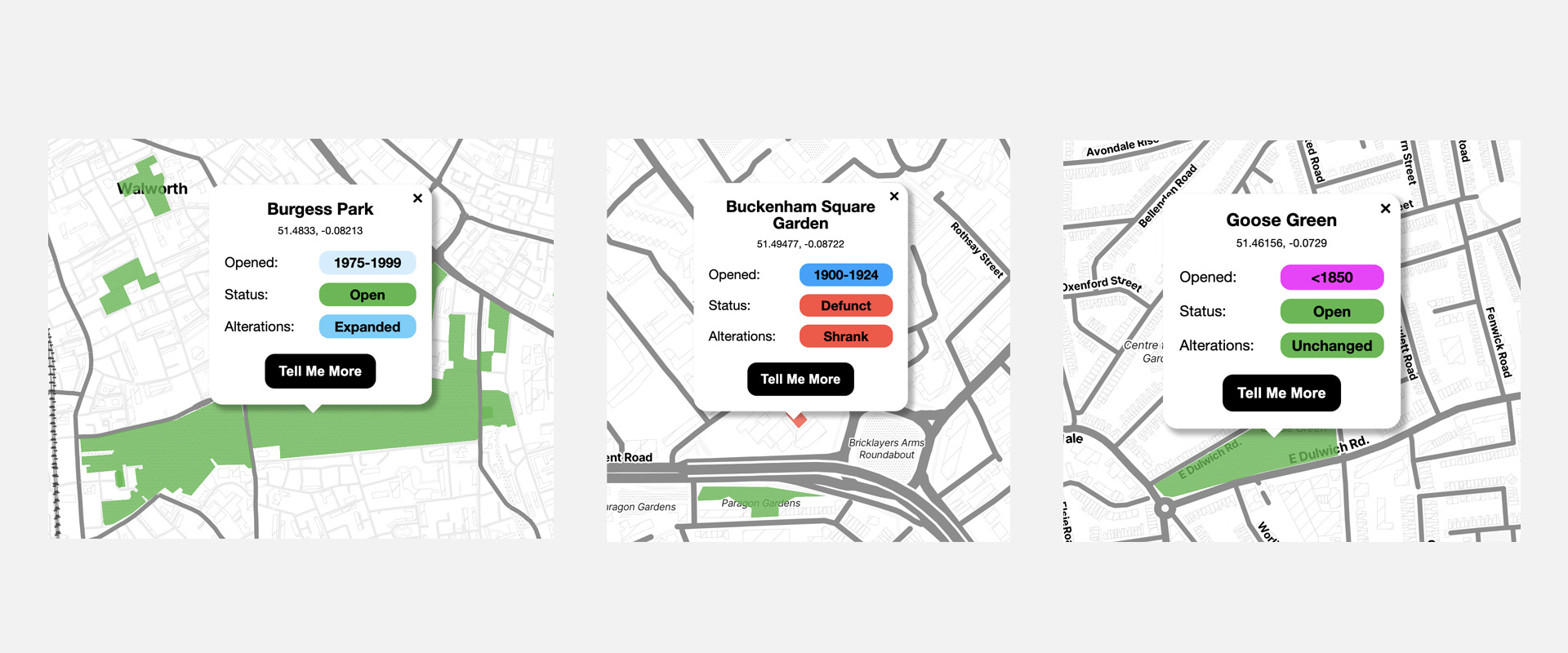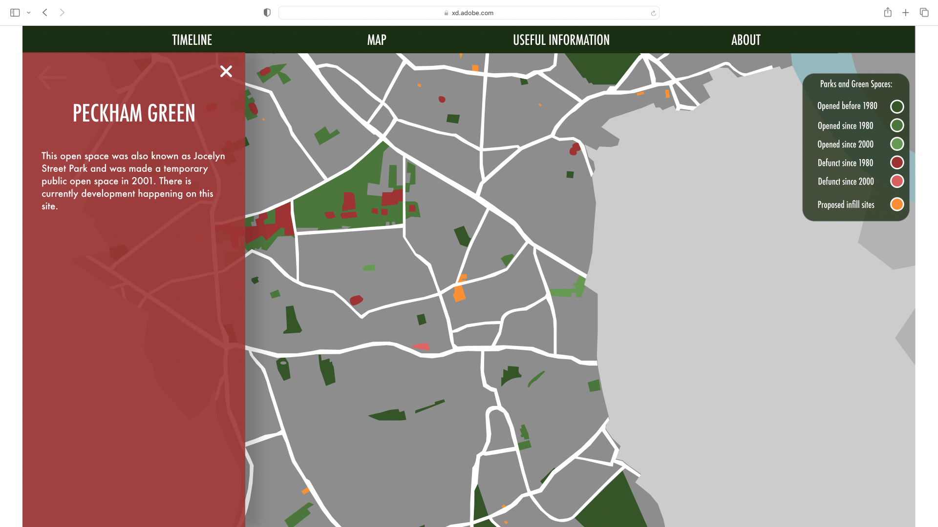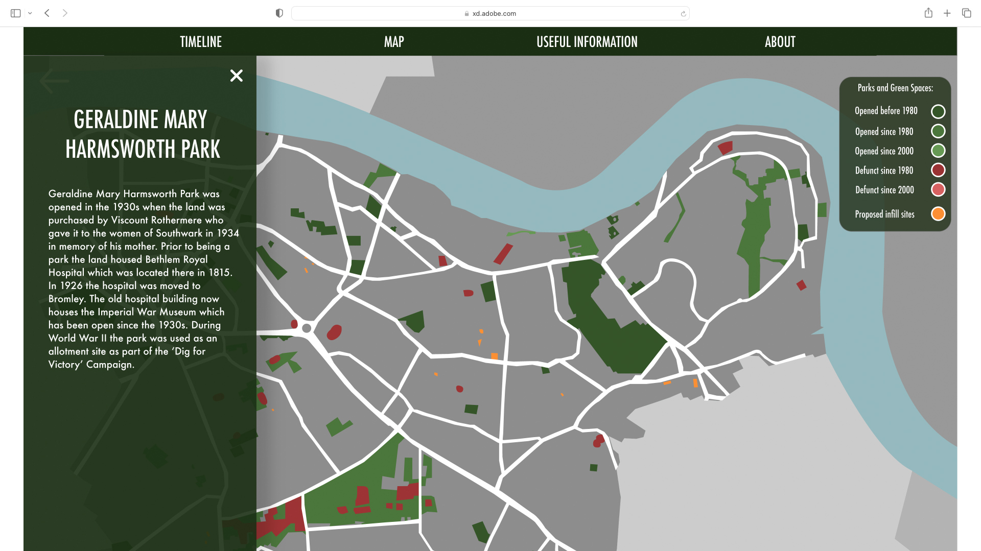 Screenshot from the original London Parkive depicting information on a park that has been clicked on.