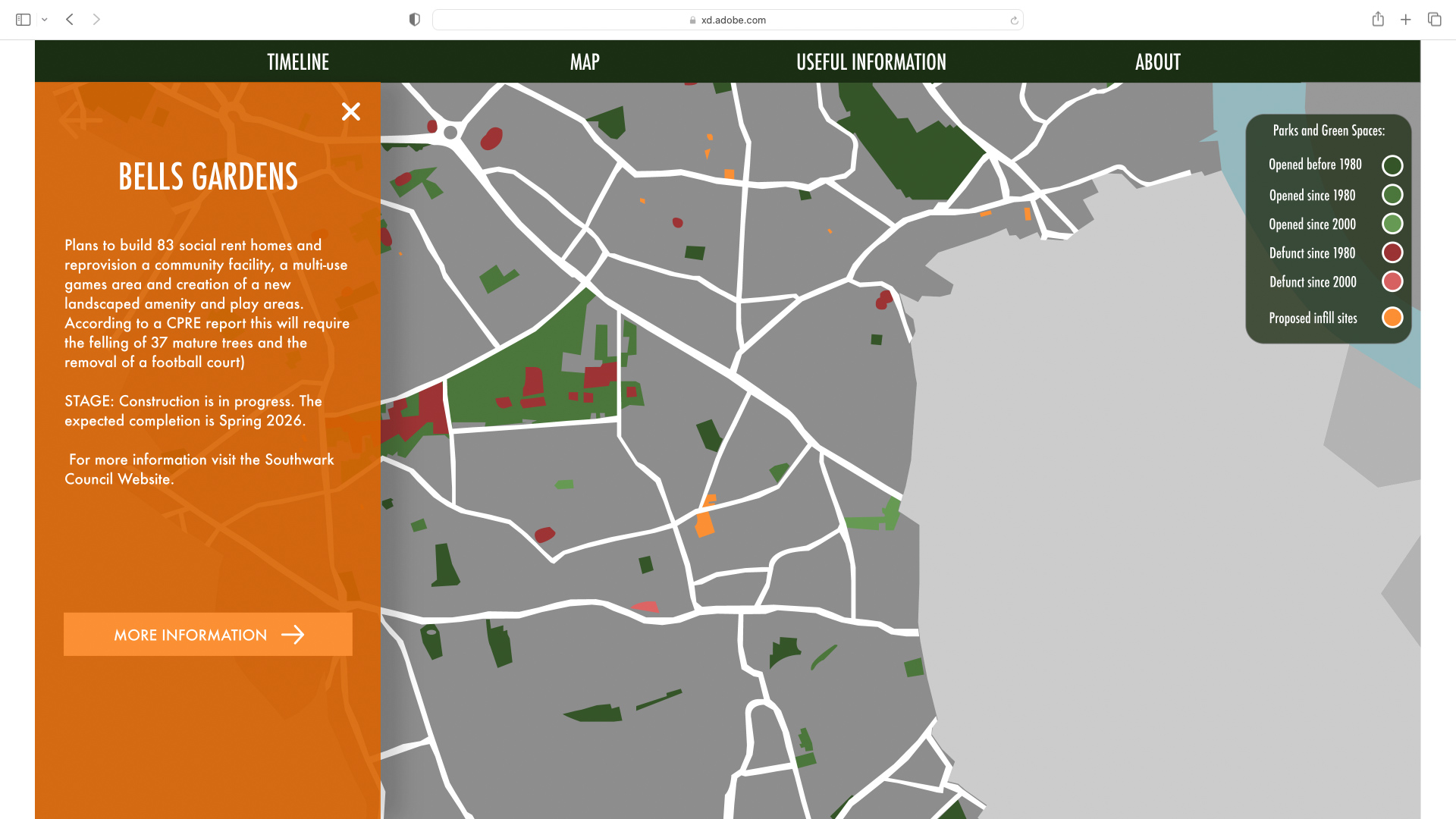 Researching parks and open spaces also took up a large chunk of the project. Like the V2 of the London Parkive, the original project also focused on Southwark and the research involved visiting Southwark archives to find, in particular, old lists of parks and open spaces so I could spot any parks that don’t exist anymore. In this version I also included some examples of infill sites, which are sites, often green spaces found on housing estates that have new houses built on them. This has been controversial within Southwark because on the one hand new social housing is much needed but on the other hand building on these sites can adversely affect the quality of life of those already living there.