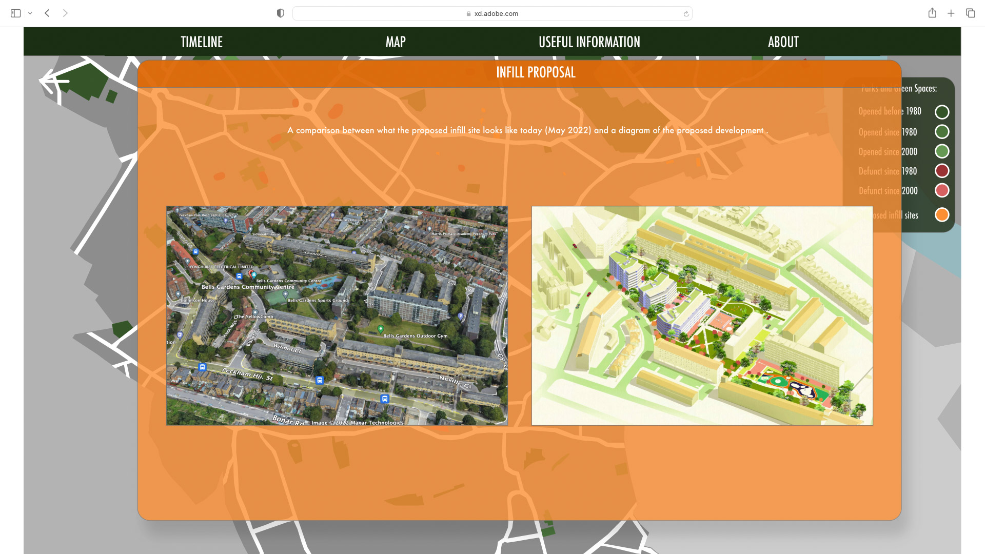 When the “More Information” button is clicked an overlay pops up depicting comparisons between what the original site looked like and what it will look like after the new development is built.