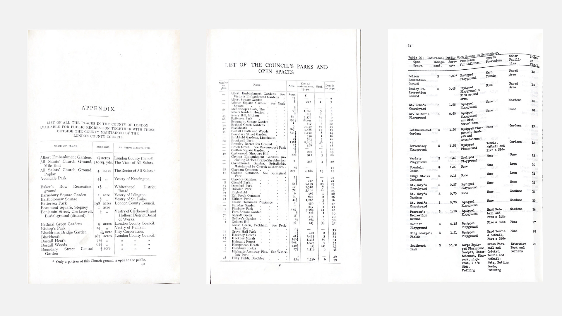 Photos of some of the lists I have been using to determine parks that no longer exist anymore. [From Left to Right: ‘The Municipal Parks, Gardens and Open Spaces of London’ (1905), London Parks and Open Spaces (1924), Recreation in Southwark (1980).