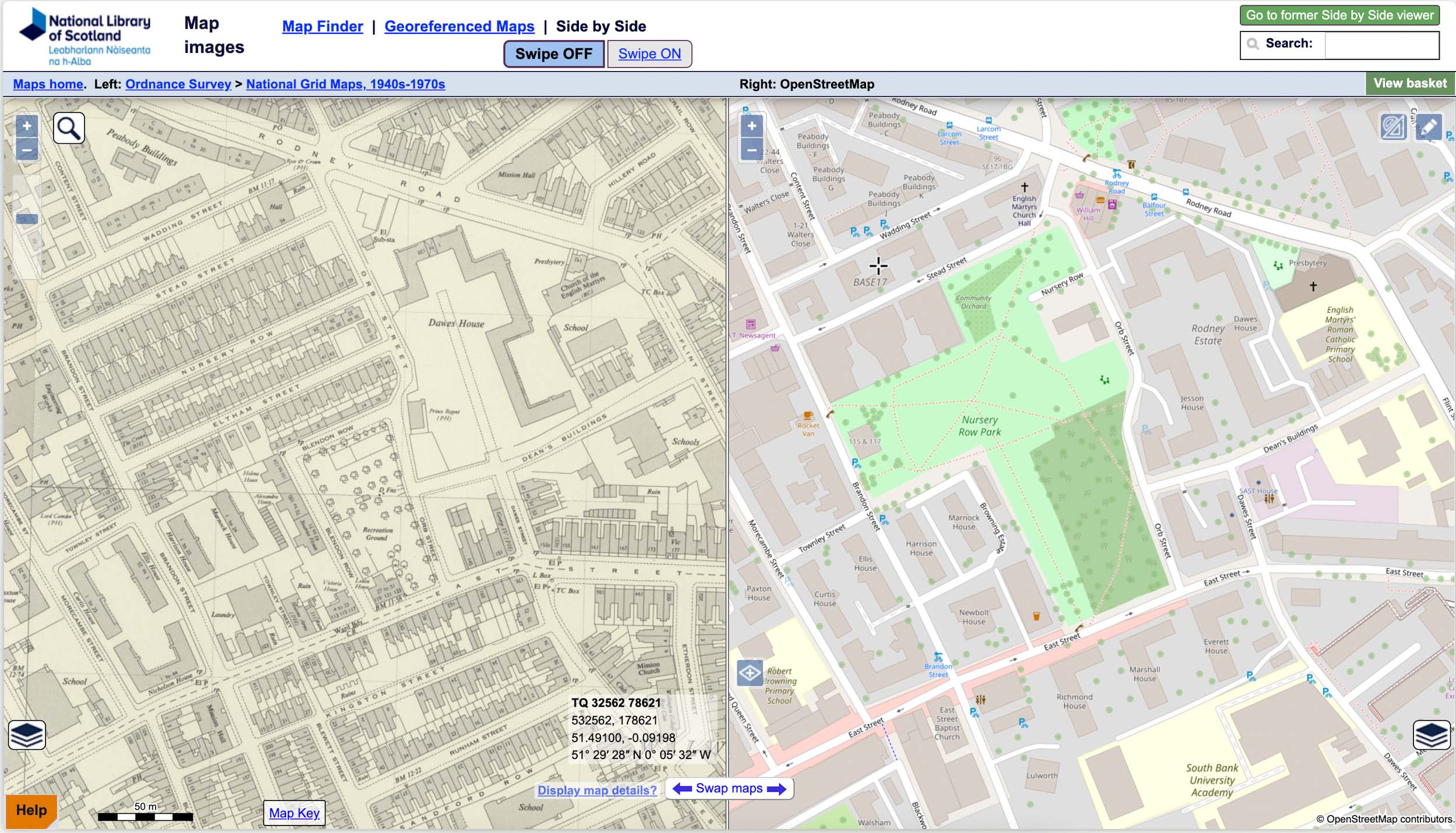 Screenshot from National Library of Scotland’s website depicting a side by side comparison of Nursery Row Park. The map on the left is an old Ordnance Survey map dating from 1951 while the map on the right is a current map.