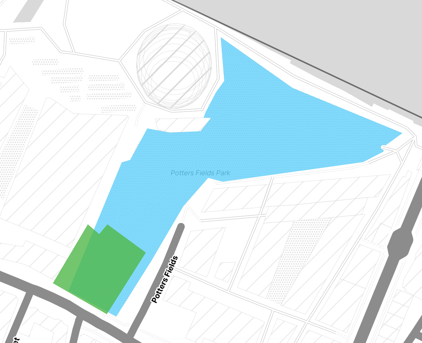 This screenshot depicts Potters Field Park, which since it first opened has been expanded. The green area shows the original park area and the blue shows where the boundaries have been expanded to.