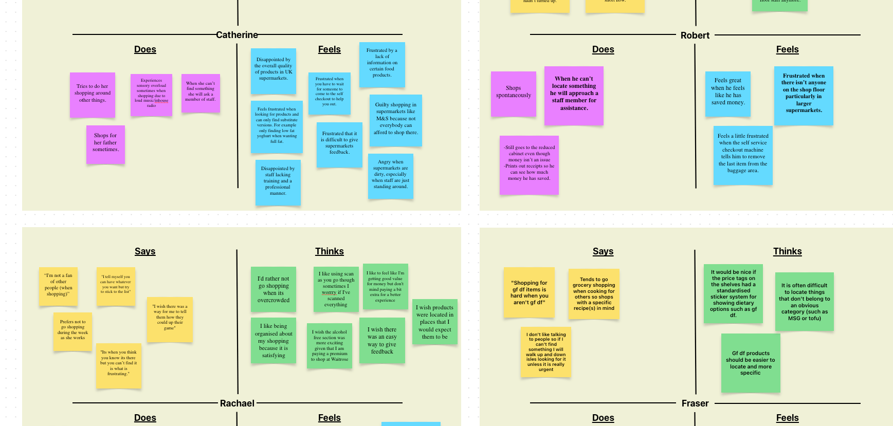 I started the project by conducting interviews with a range of people from different demographics to understand how they do their grocery shopping, how it fits into their schedules and to identify any frustrations that they experience along the way.