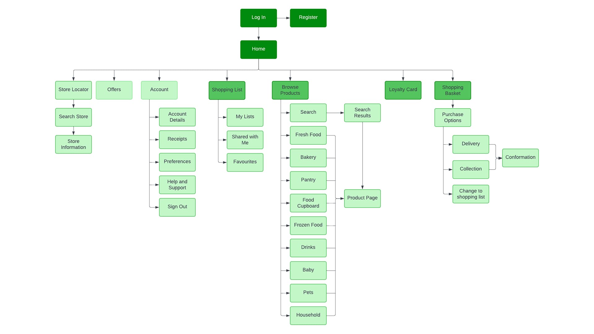 A screenshot of the information arcitecture diagram which was made using Lucid Charts
