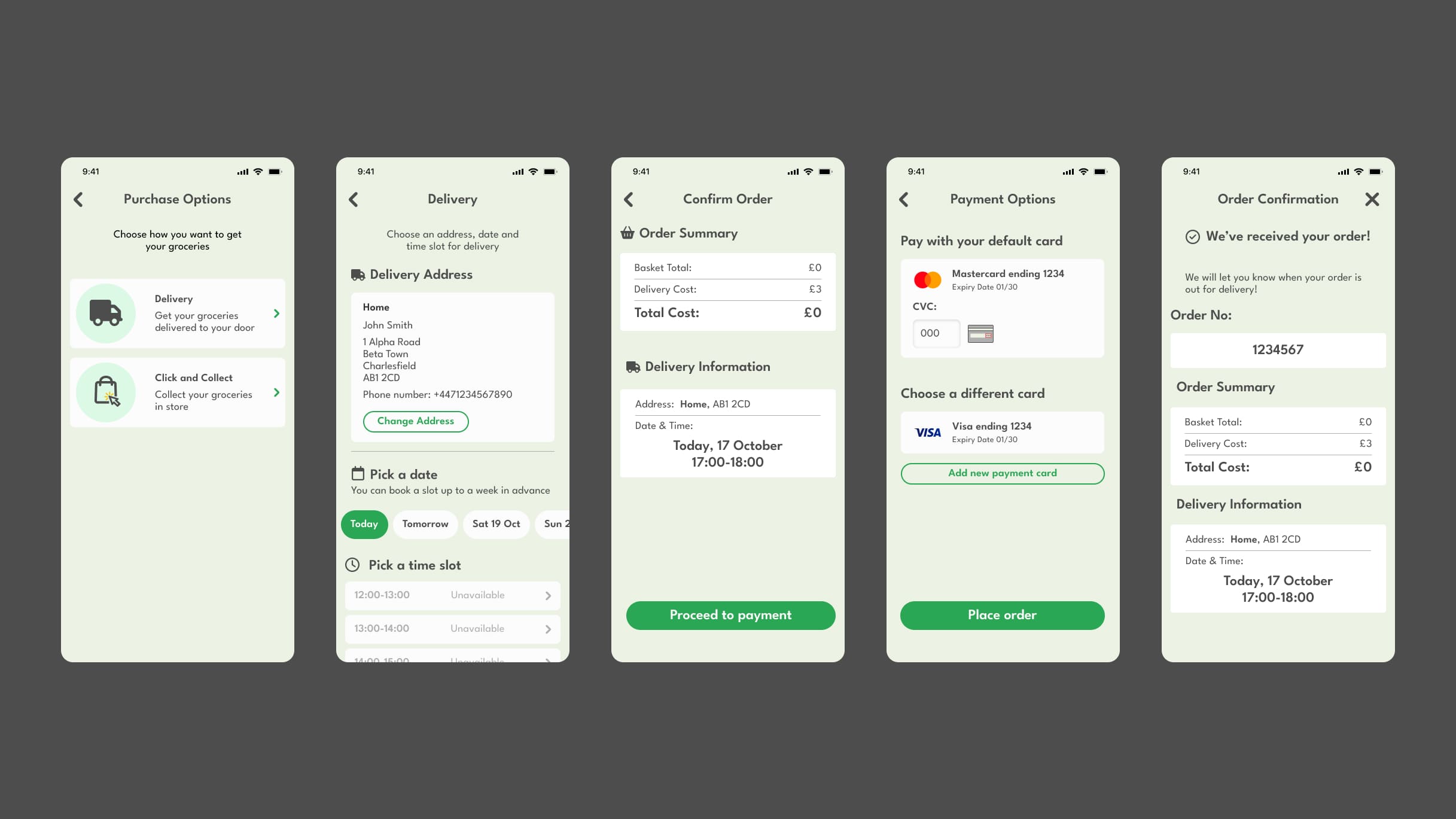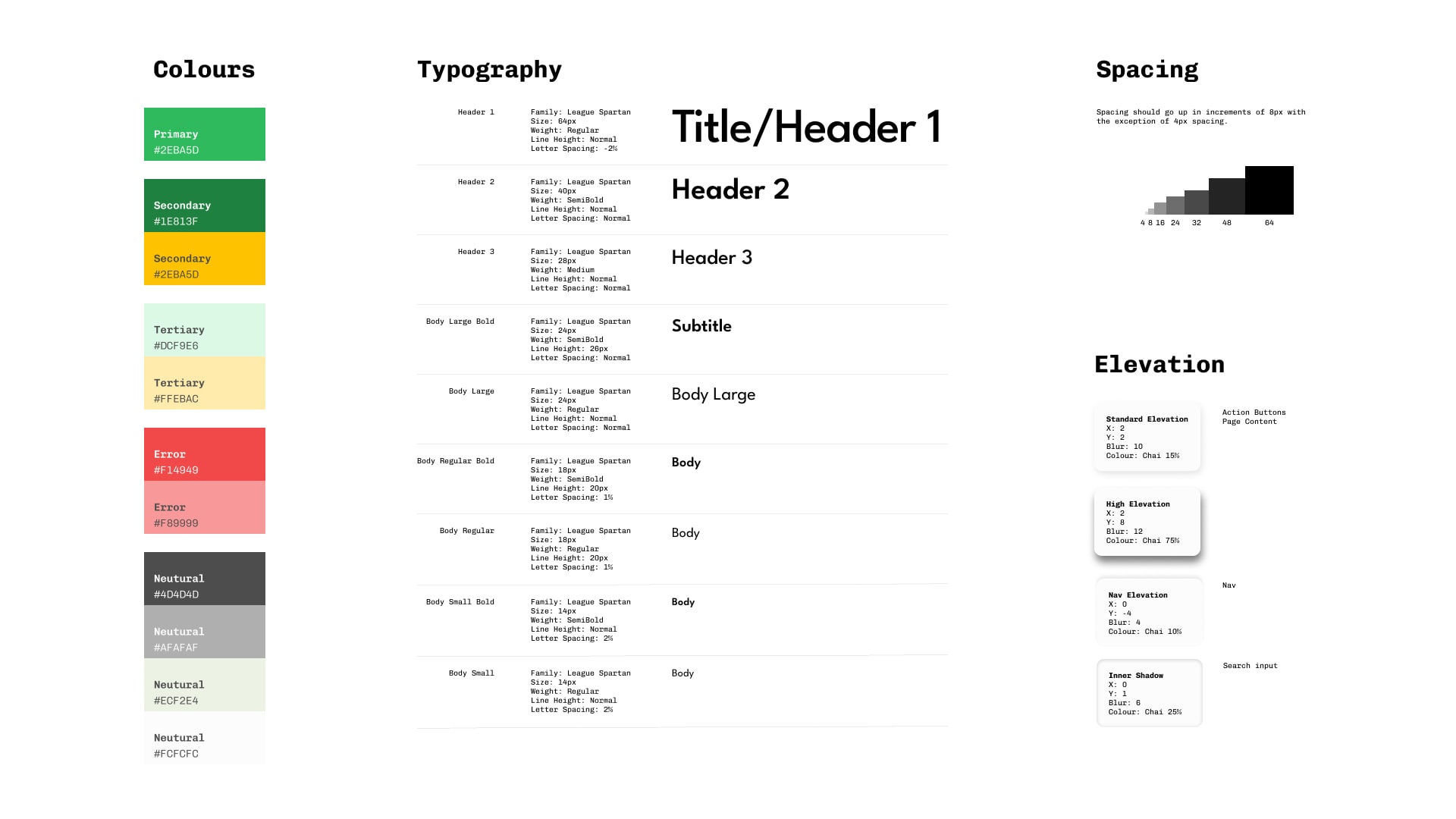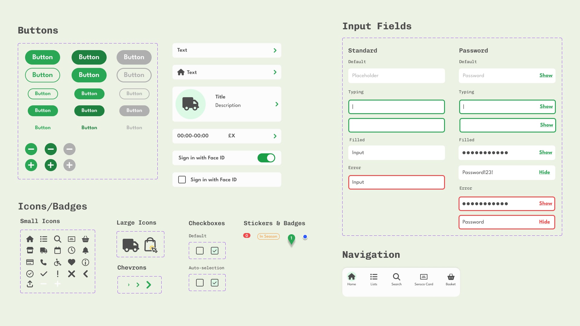 As the mock ups were being created I started to standardise everything and eventually created a design system and UI library to guide the aesthetic choices I was making. For the colour palette I decided to use shades of green as the primary colour. This is because Sensco’s primary colour palette is green which was chosen because it conjures up a feeling of organic, freshness and nature which ties in nicely with the fact it sells groceries.