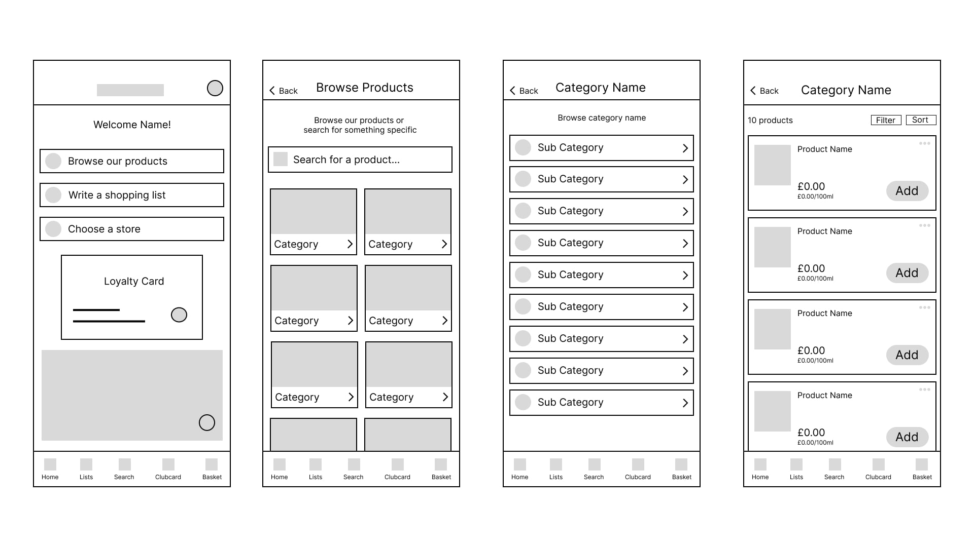 These paper wireframes were then digitised and turned into low fidelity prototypes.