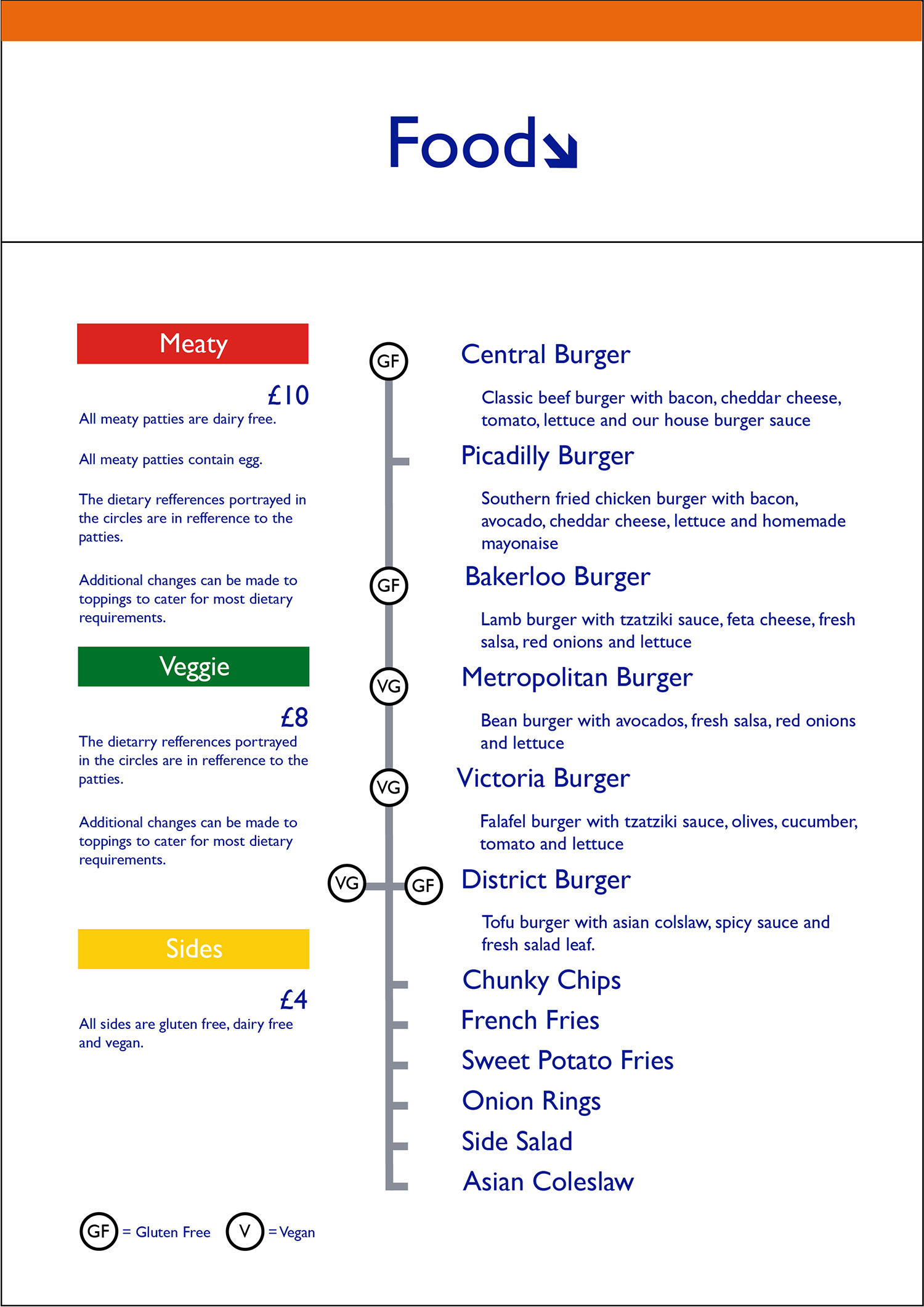 The menus are inspired by the line maps in the London Underground. Using my background experience as a chef I also designed the menu itself to try and create a menu that would be delicious for all kinds of eaters!